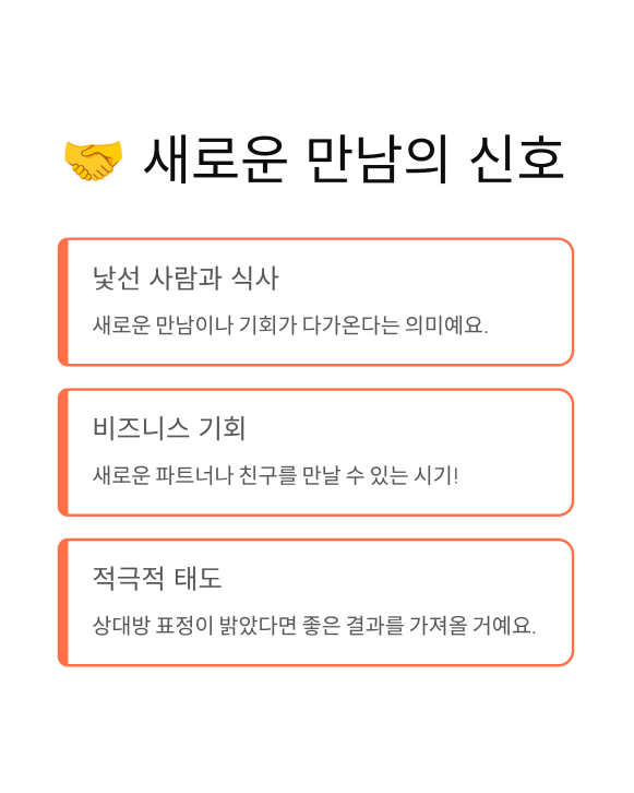 낯선 사람과 밥을 먹는 꿈이라면 새로운 만남이나 기회가 다가온다는 의미예요. 비즈니스 파트너나 새로운 친구를 만날 수 있는 시기니까 적극적으로 사람들을 만나보세요. 밥먹는 꿈에서 상대방의 표정이 밝았다면 그 만남은 분명 좋은 결과를 가져올 거예요!