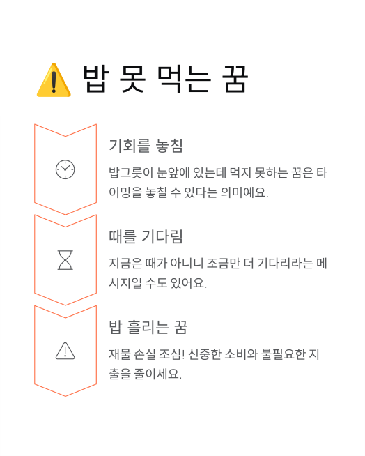 밥을 먹고 싶은데 못 먹는 꿈은 아쉬운 해몽이에요. 밥그릇이 눈앞에 있는데 먹지 못하거나 밥이 사라지는 꿈은 기회를 놓친다는 의미일 수 있어요. 하지만 이것도 나쁘게만 볼 건 아니에요. 지금은 때가 아니니 조금만 더 기다리라는 메시지일 수도 있거든요. 타이밍이 중요한 거죠!