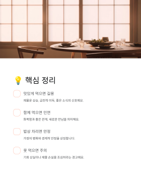 지금까지 밥먹는 꿈 해몽에 대해 자세히 알아봤어요. 혼자 먹는지 함께 먹는지, 맛있게 먹는지 그렇지 않은지에 따라 의미가 다르다는 것! 밥상 차리는 꿈은 길몽이고, 밥을 못 먹는 꿈은 기회를 놓칠 수 있다는 경고라는 것도 기억하세요. 무엇보다 중요한 건 꿈의 메시지를 긍정적으로 받아들이고 현실에서 잘 활용하는 거예요.